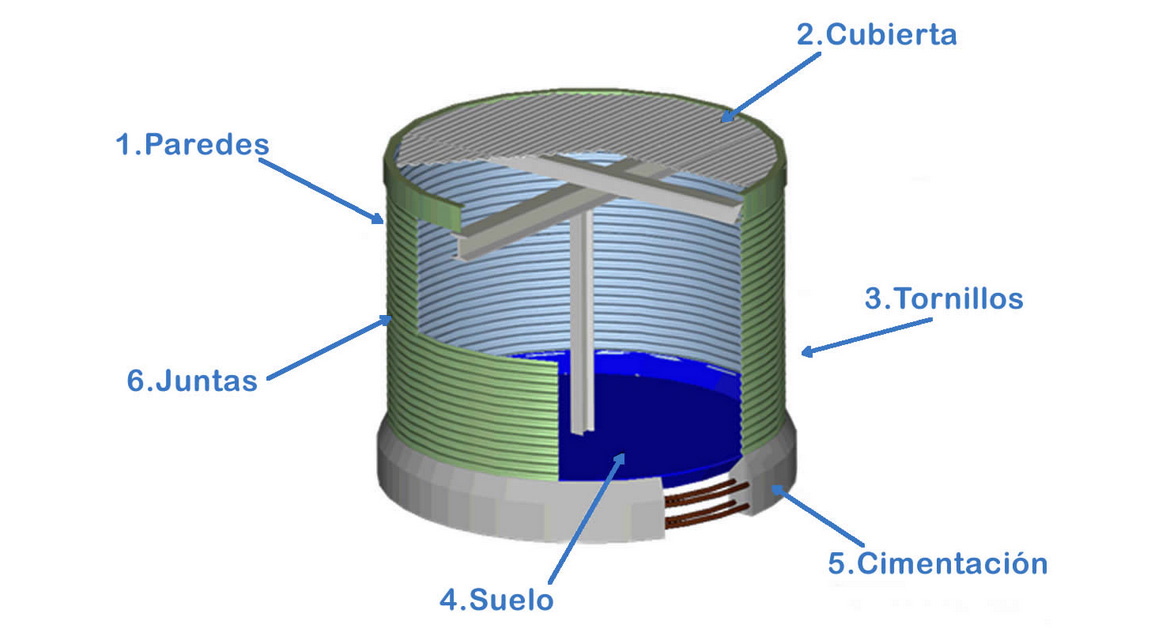 El montaje del depósito es muy rápido debido a que las operaciones in situ son minimas, estando todos los componentes del depósito prefabricados para ser solamente atornillados en obra.Esto reduce mucho los costes de montaje. Una vez terminado el zuncho perimetral se monta y une al mismo el primer anillo de chapa, para posteriormente, proseguir con el resto de los anillos y colocar finalmente la cubierta y el suelo de láminas impermeabilizante de pvc queda atornillado al depósito.